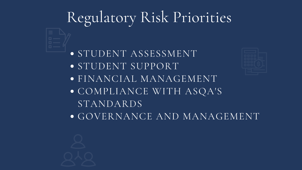 - Pay attention to the specific risk areas that ASQA has identified. For example, if you offer online courses, make sure that you have robust quality assurance processes in place.