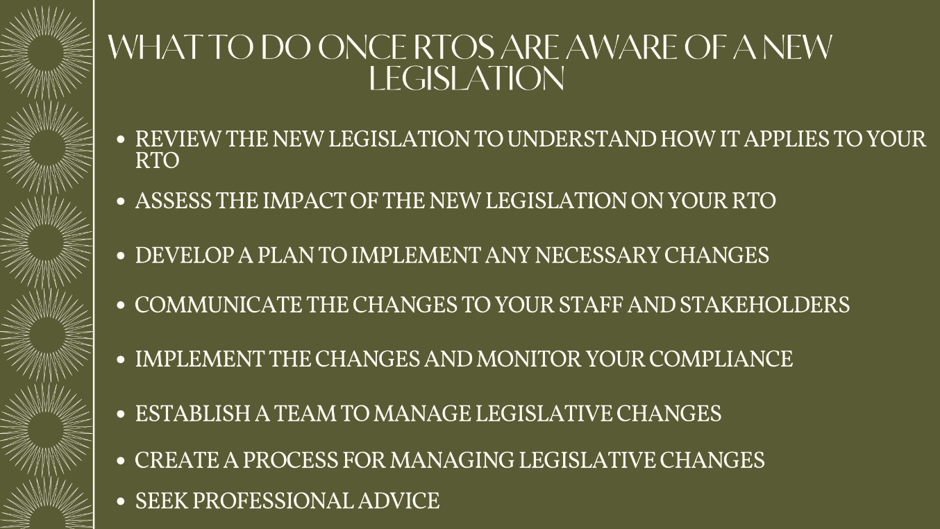 - Review the new legislation to understand how it applies to your RTO. The first step is to read and understand the new legislation to determine how it applies to your RTO. You should pay attention to the key requirements of the legislation, the implementation timeline, and any penalties for non-RTO compliance.