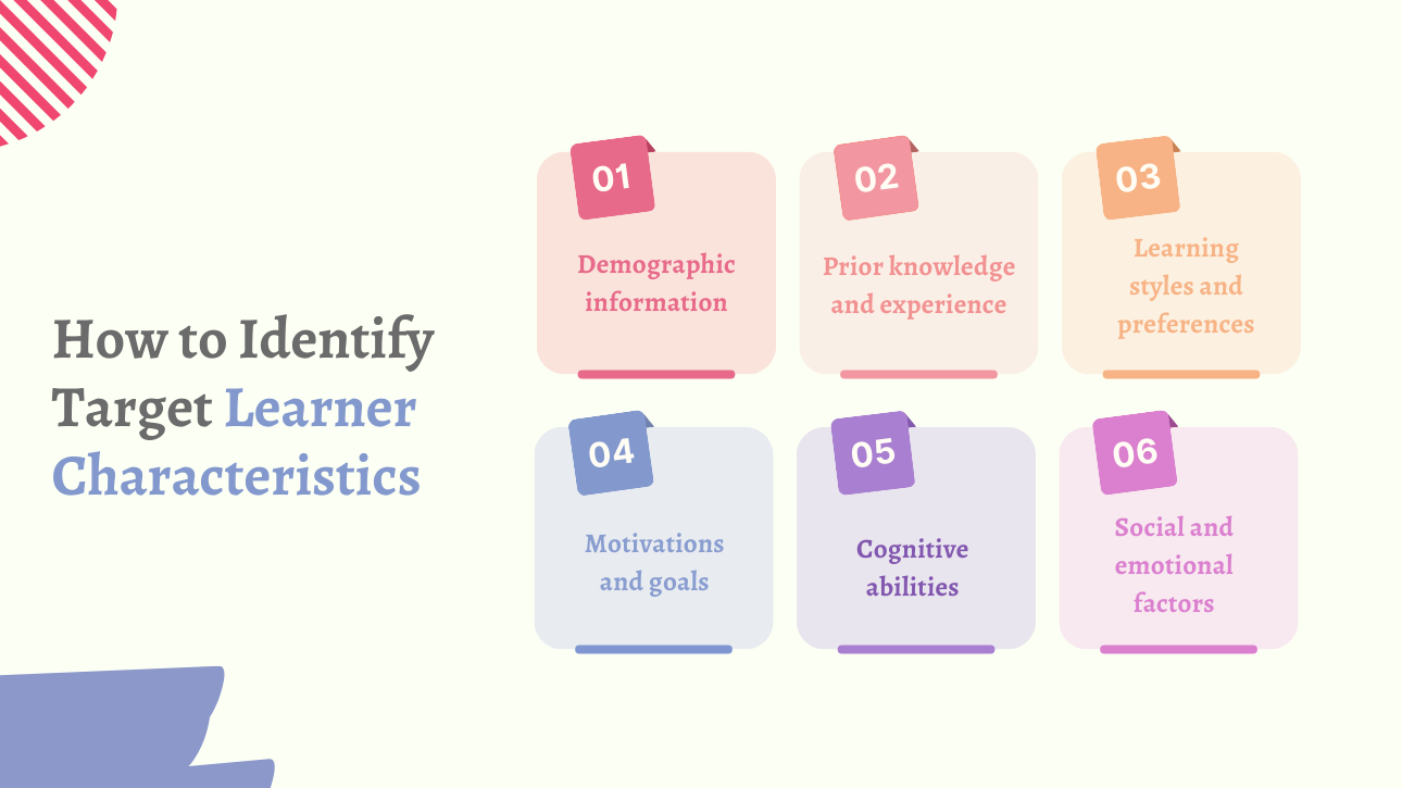 - Motivations and goals: This includes the learner’s reasons for wanting to learn and their desired outcomes.